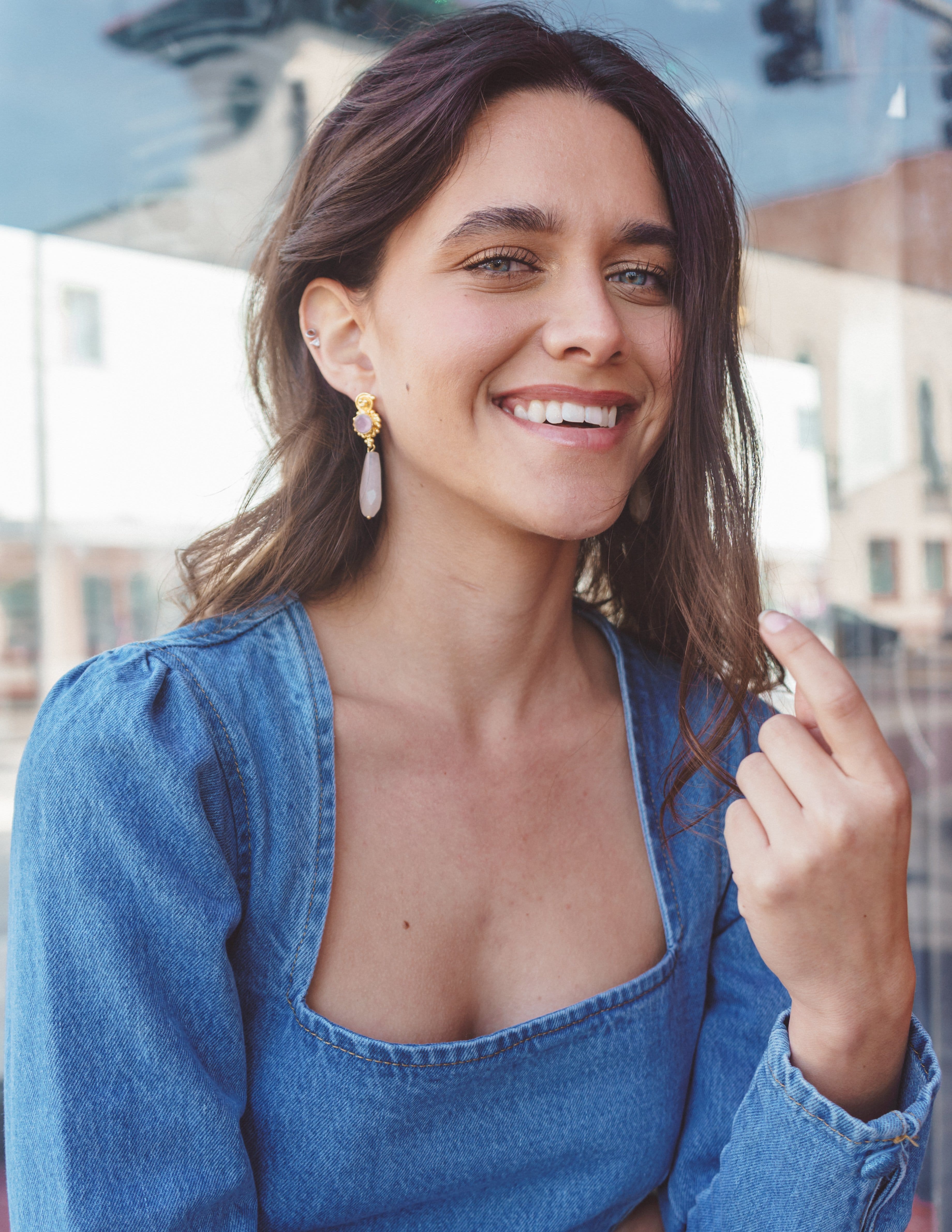 Bergenia Pink Chalcedony stone Earring inspired by the elegance of the Bergenia flower. Handmade with 22k Gold Plated Brass featuring Natural Pink Chalcedony gemstones.