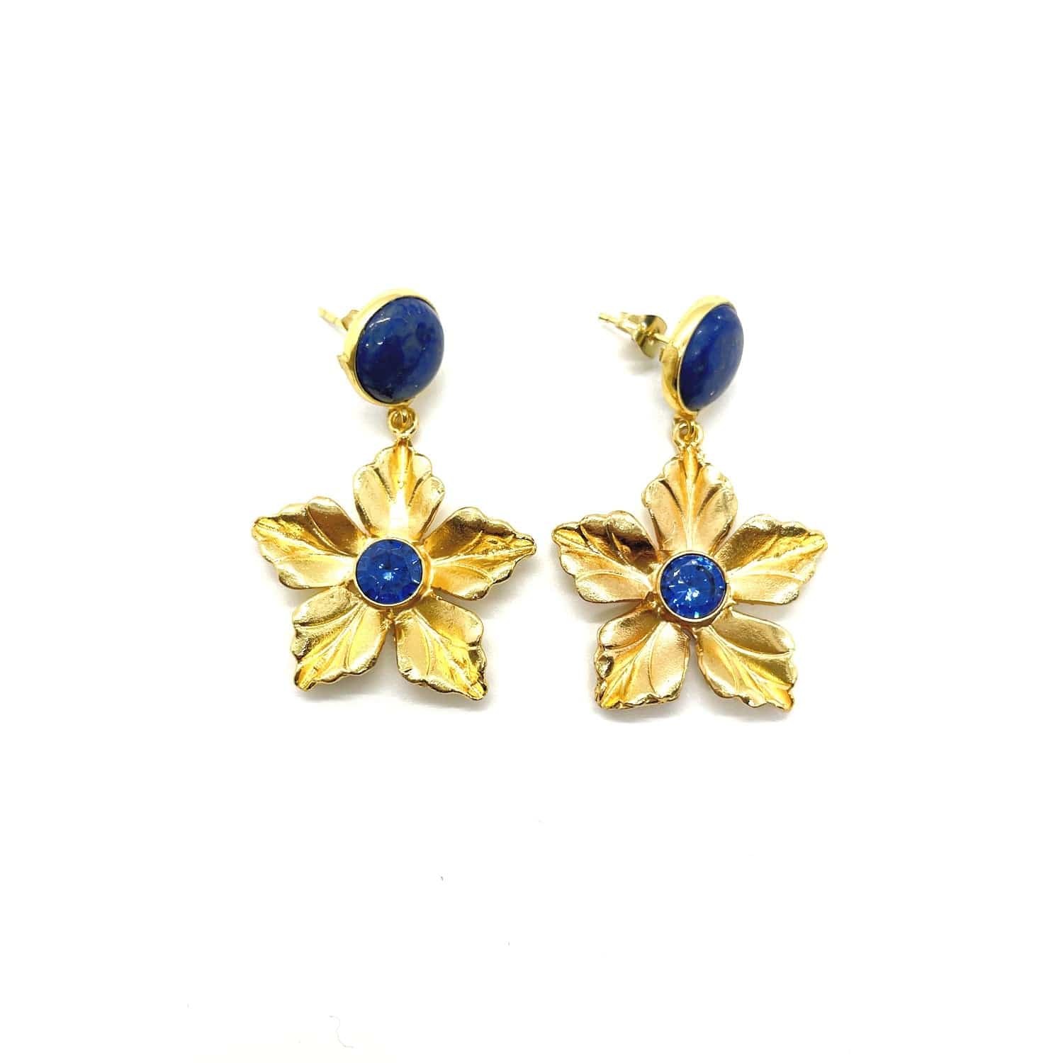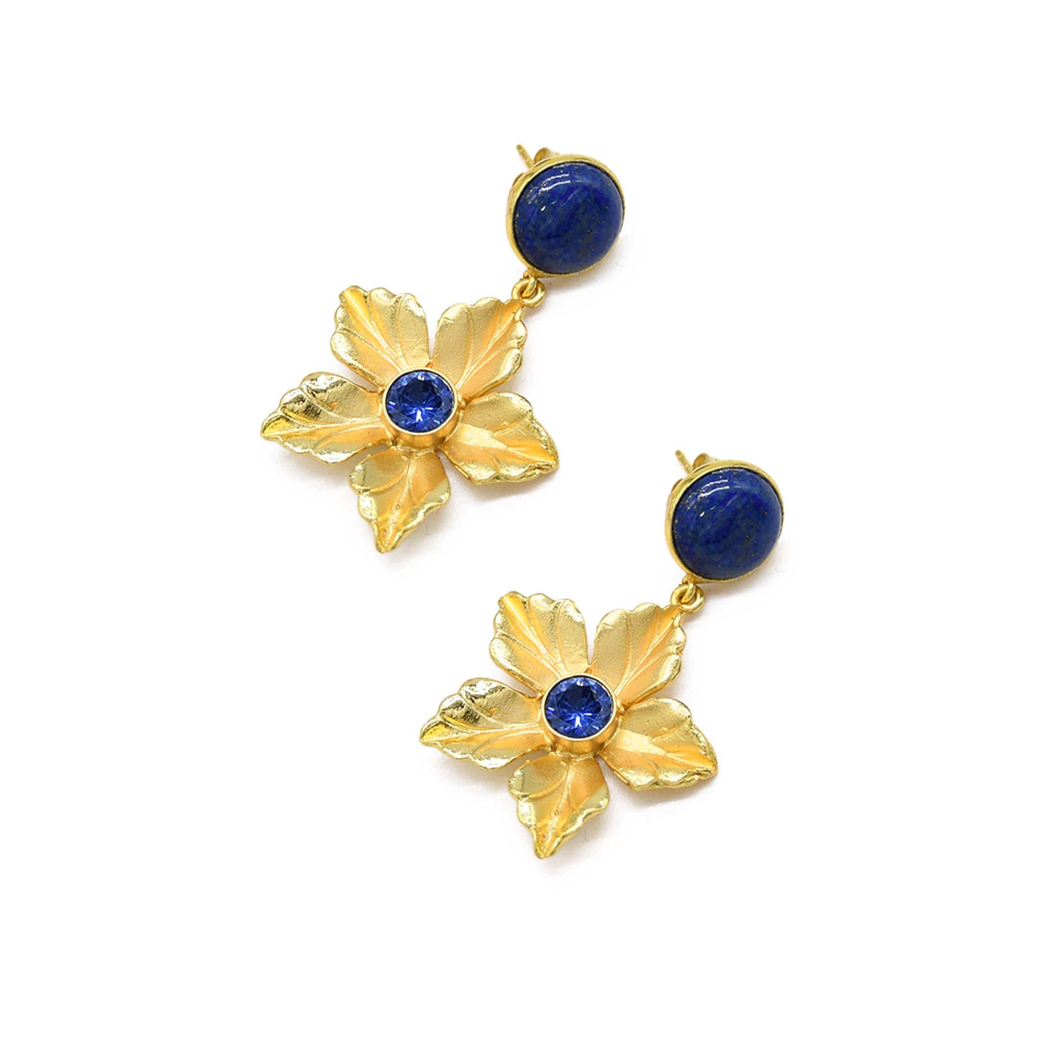 Floral Sapphire and Lapis Lazuli Earrings is handmade with 22k gold plated brass featuring natural lapis lazuli gemstone ear post and handmade floral pendant with sapphire gemstone.