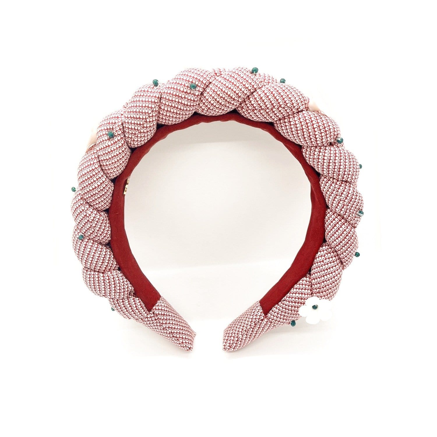 Gloxinia Headband inspired by the Gloxinia Flower symbolizing love from first sight. Gloxinia headband is hand-sewn hight quality Kimono pure natural silk 100% base beaded with emerald green crystals and clay white flowers.
