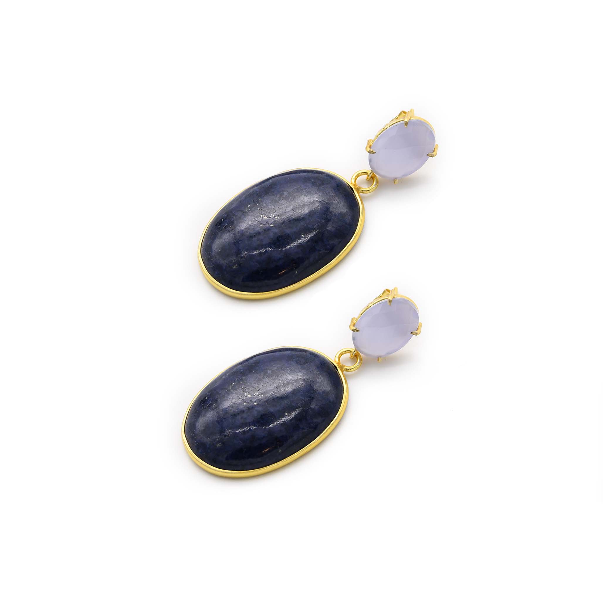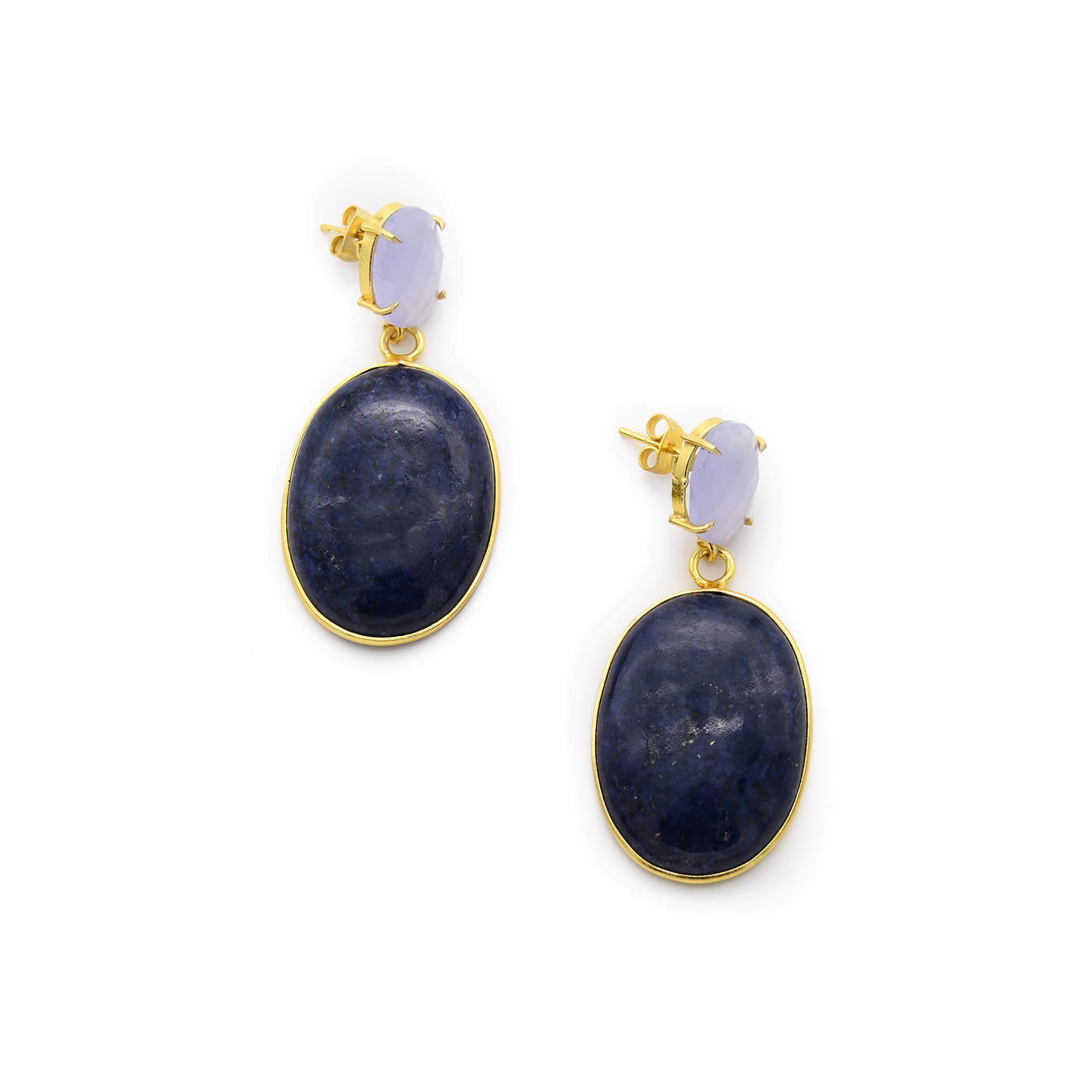 Lavender Chalcedony & Lapis Lazuli Earring is handmade with 22k gold plated brass featuring lavender chalcedony stone and precious lapis lazuli bezel stone.