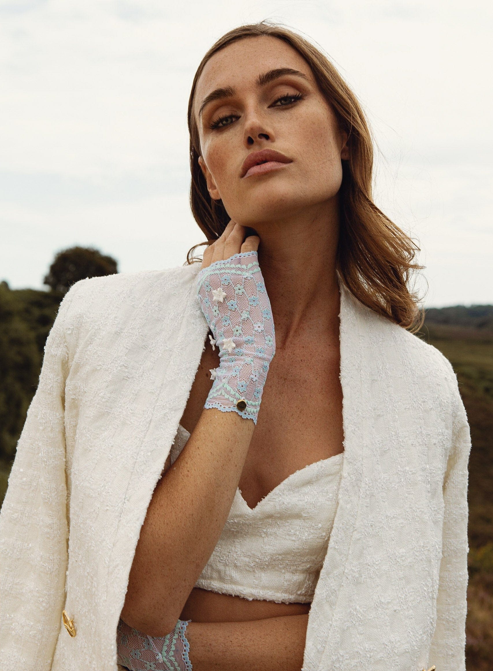 Pastel Floral lace gloves is handmade with beautiful high quality stretchy lace featuring beautiful precious clear crystals and sewn in clay white flowers.
