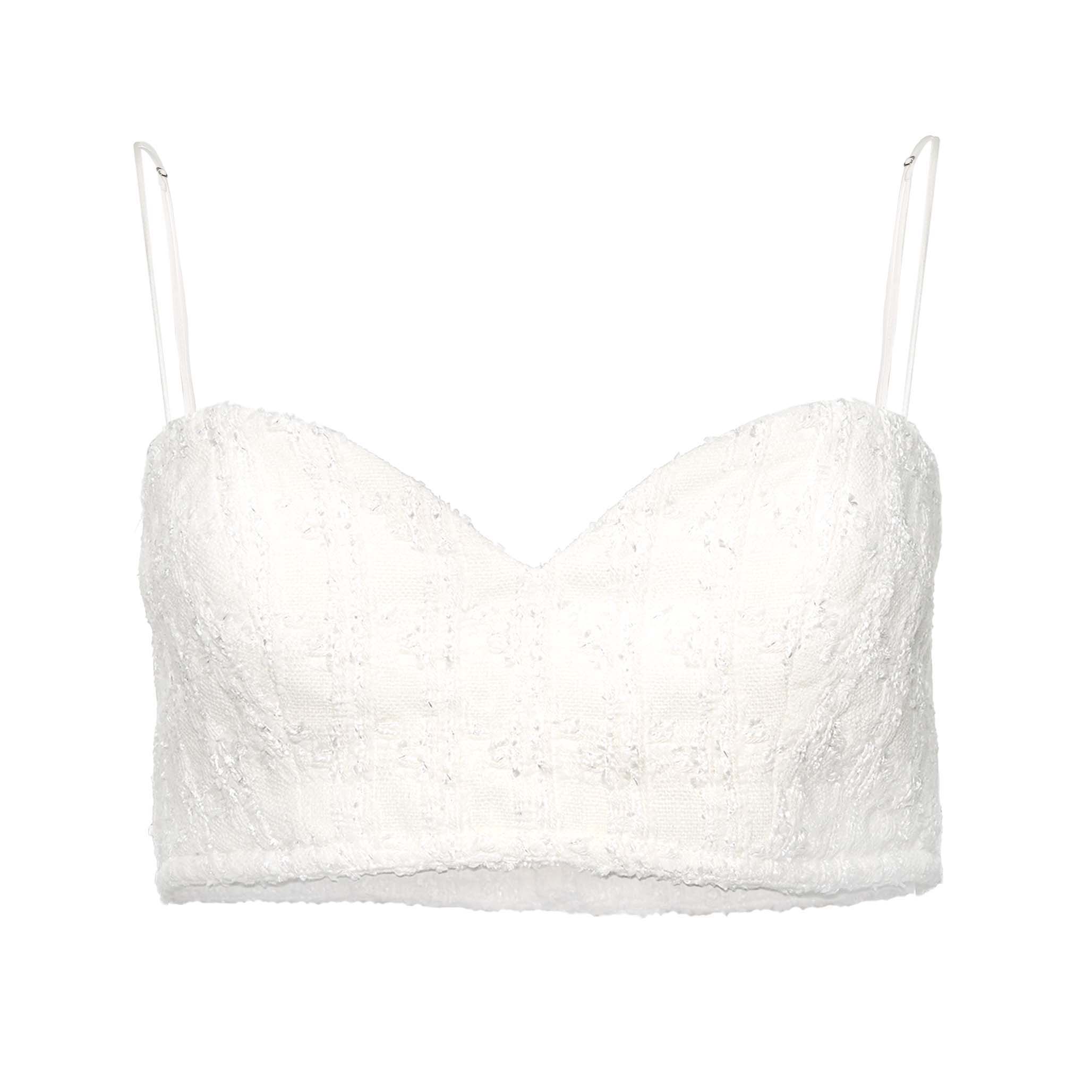 Pearl White Bralette inspired by eclectic vision to deliver unique garment to be worn at any time and season due to its light tweed material. The bralette is structured to be fitted featuring with adjustable shoulder straps and double hooks for closure.