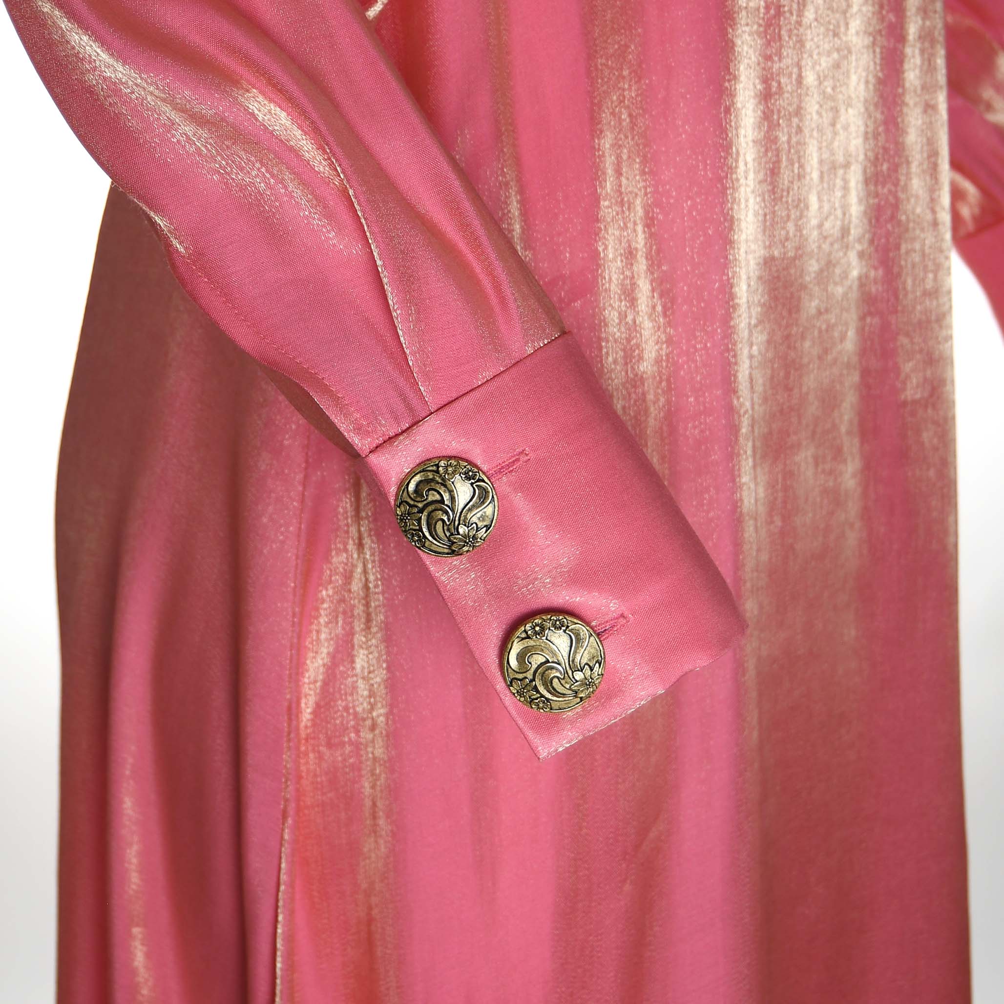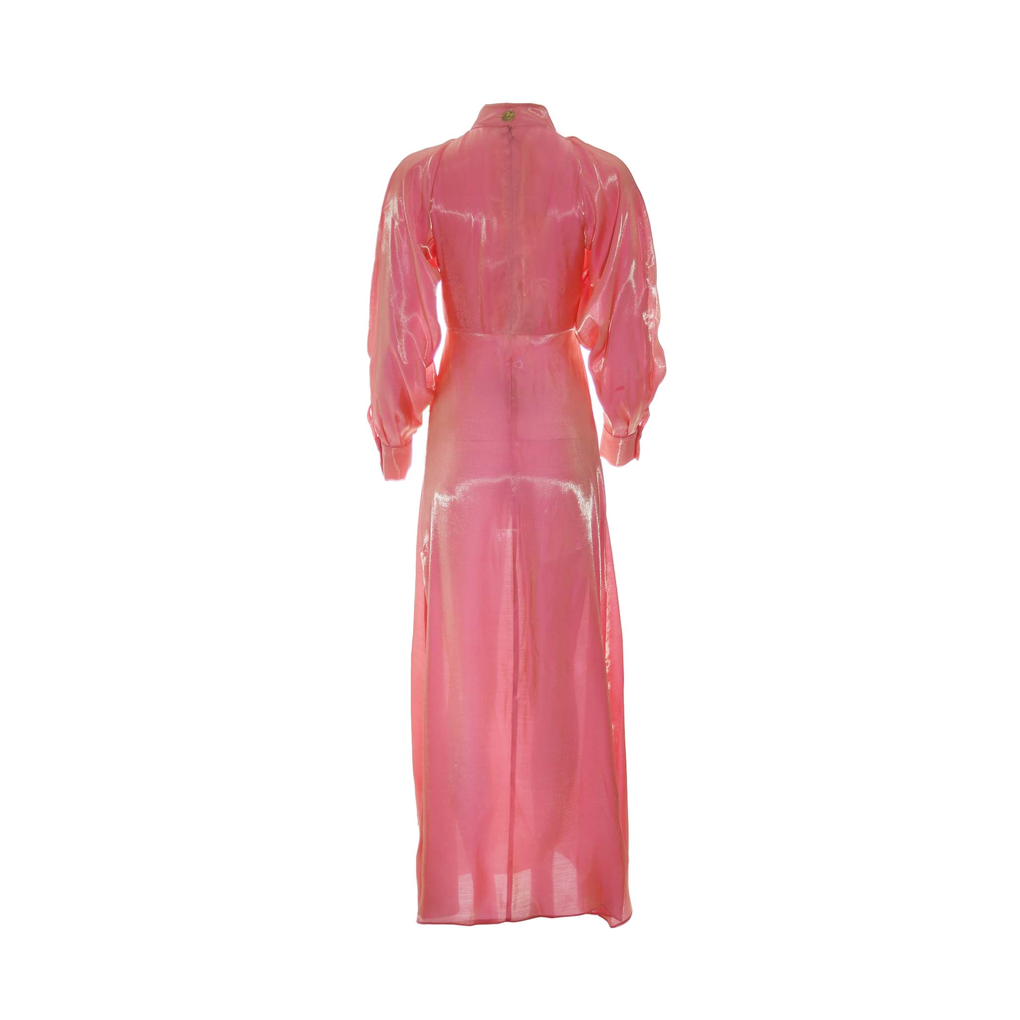 Inspired by the 70's era and the influential Gladiolus flower, the Gladiolus Dress is sure to impress all that glance upon it. Constructed from the most elegant full-length shimmer satin in a rare hot pink. The Gladiolus Dress offers a classy high-neck with a one-button closure at the back; high waisted seam and an airy flowing silhouette with an upper-thigh side slit. The sleeve is complemented by a wide 3" cuff, closed with two stunning antique-inspired gold 3D floral motif buttons. The Gladiolus Dress is named after the Gladiolus flower, meaning "Sword" in Latin which symbolize strength and integrity.