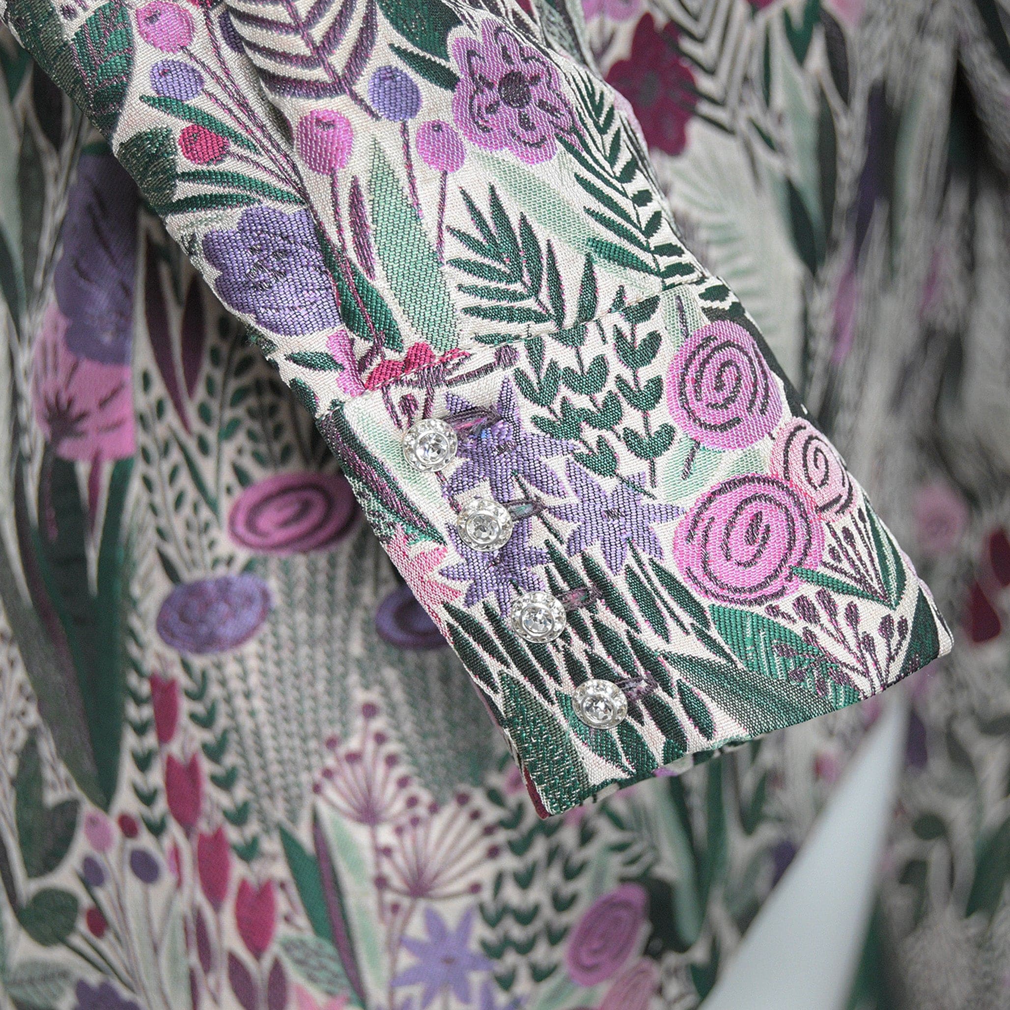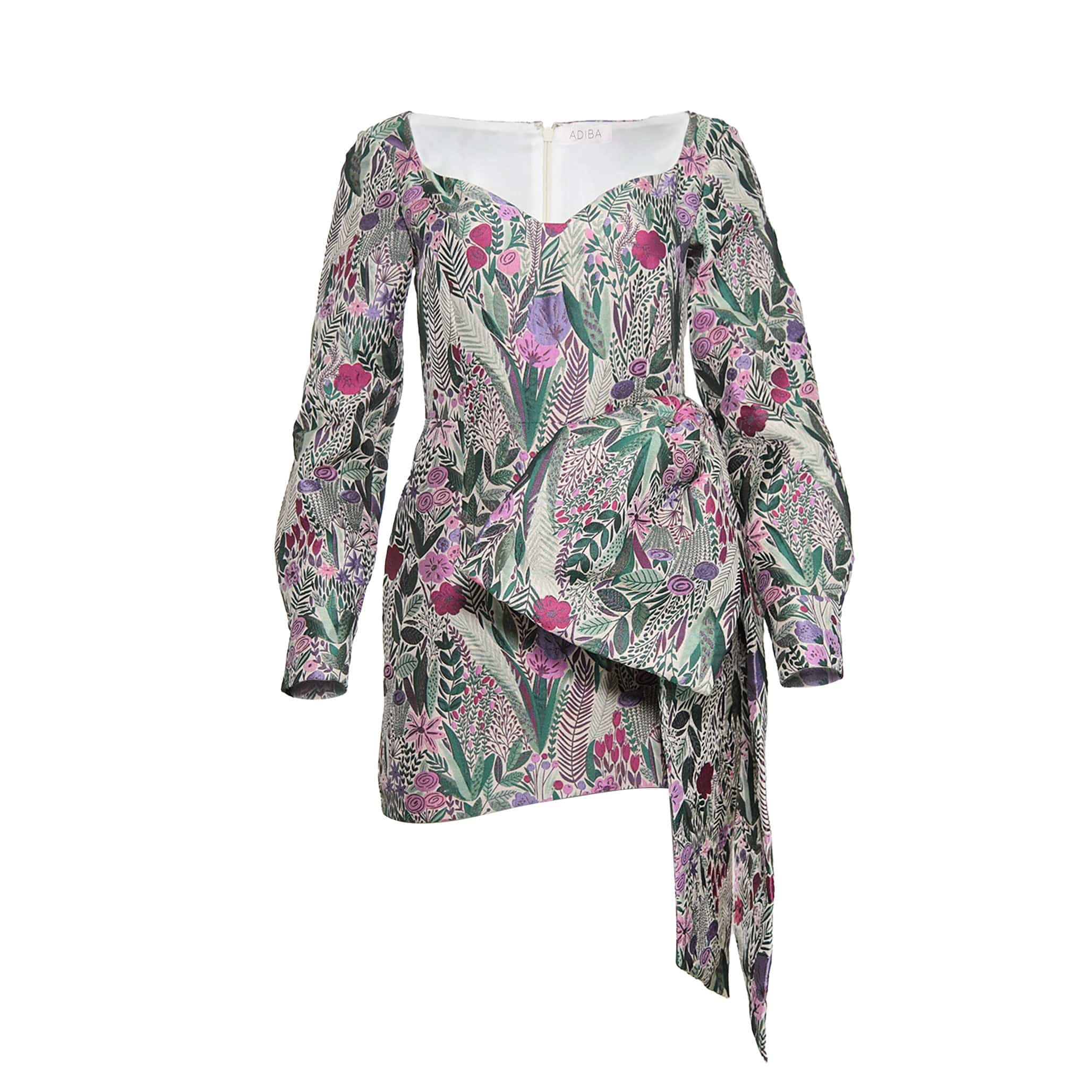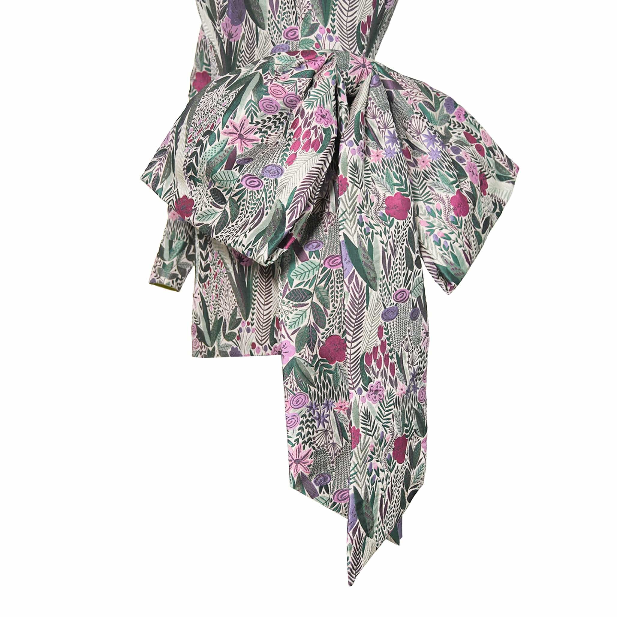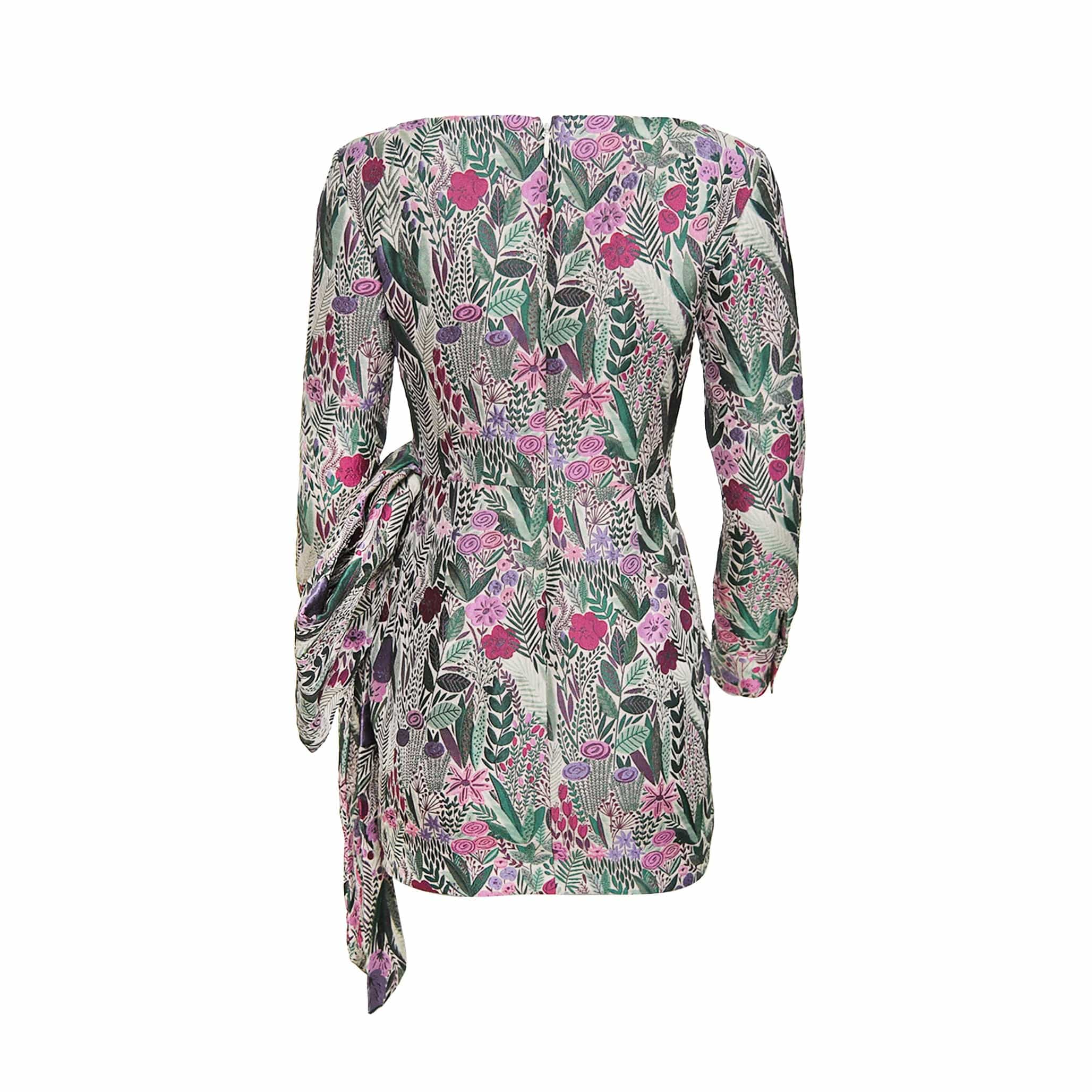 Side Bow Mini Floral Dress is classic glamorous garment adorned with large side bow featuring long sleeve finished with beautiful handmade Swarovski crystal buttons.