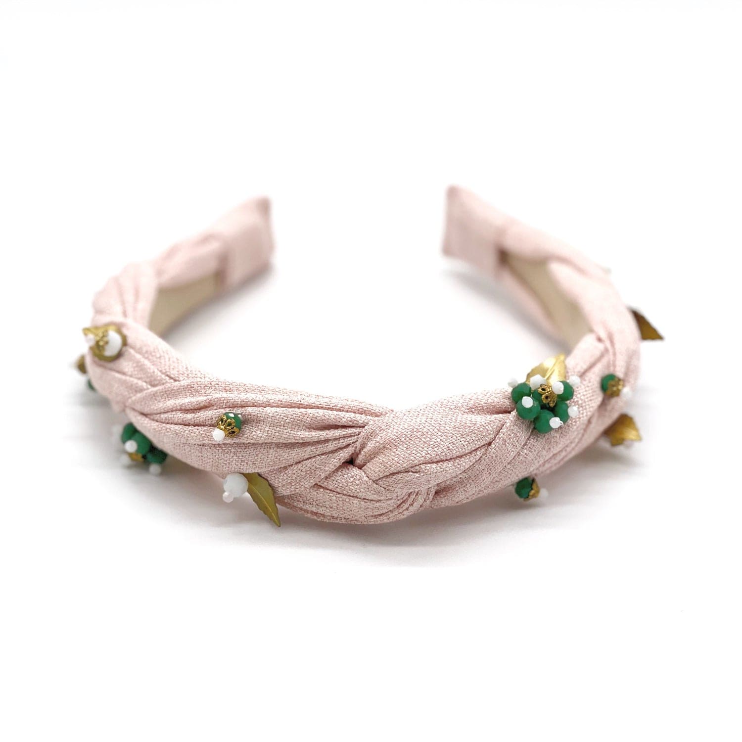 The Cutrone Headband is a soft piece with beautiful green and leaves details. Handmade with beads and hand sewn Embellishments on a woven braided base for great head comfort.