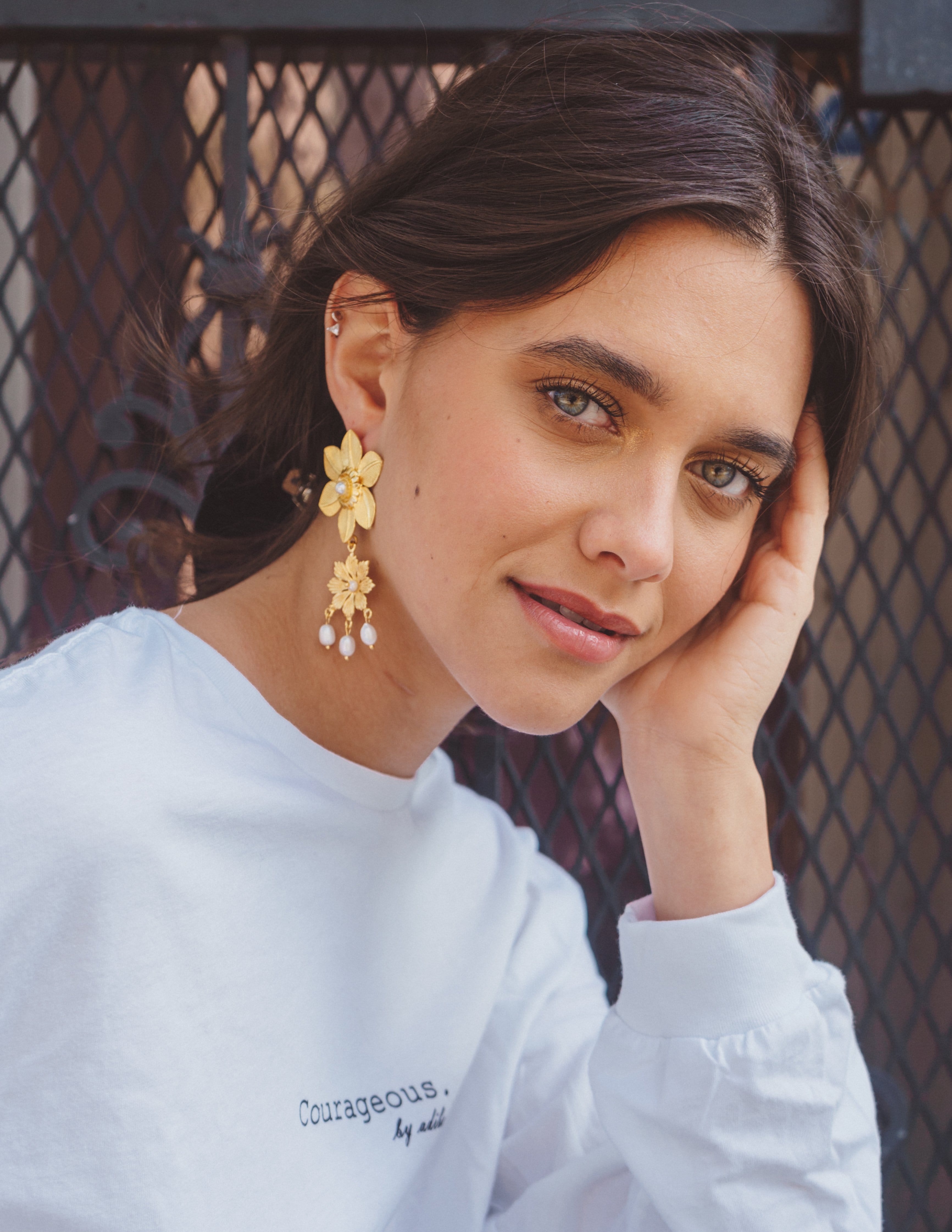 Make a statement tonight wearing this beautiful Dianella Piece. Handmade with 24K Gold Plated Brass featuring precious fresh pearls. It is a post back earring, lead and nickel free.