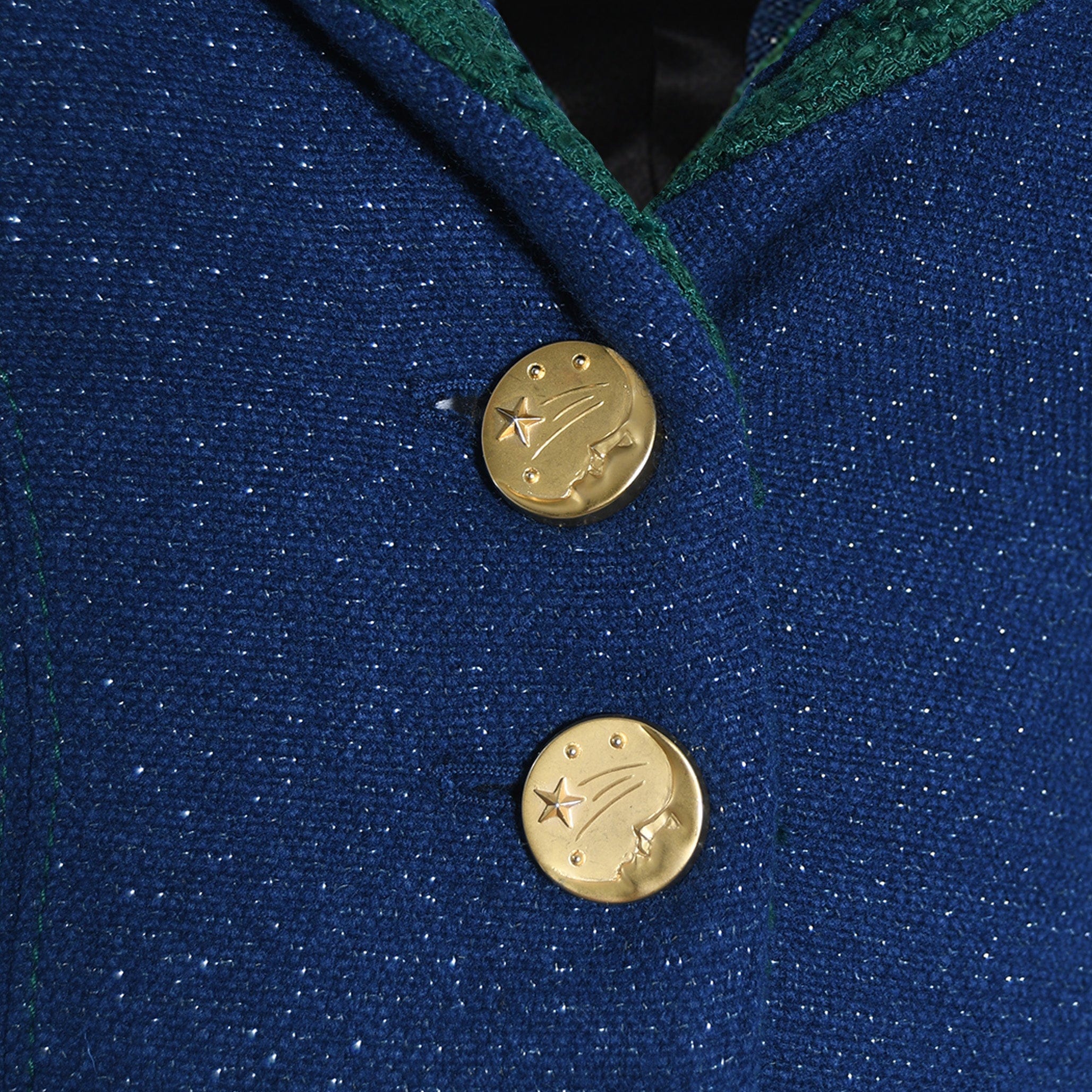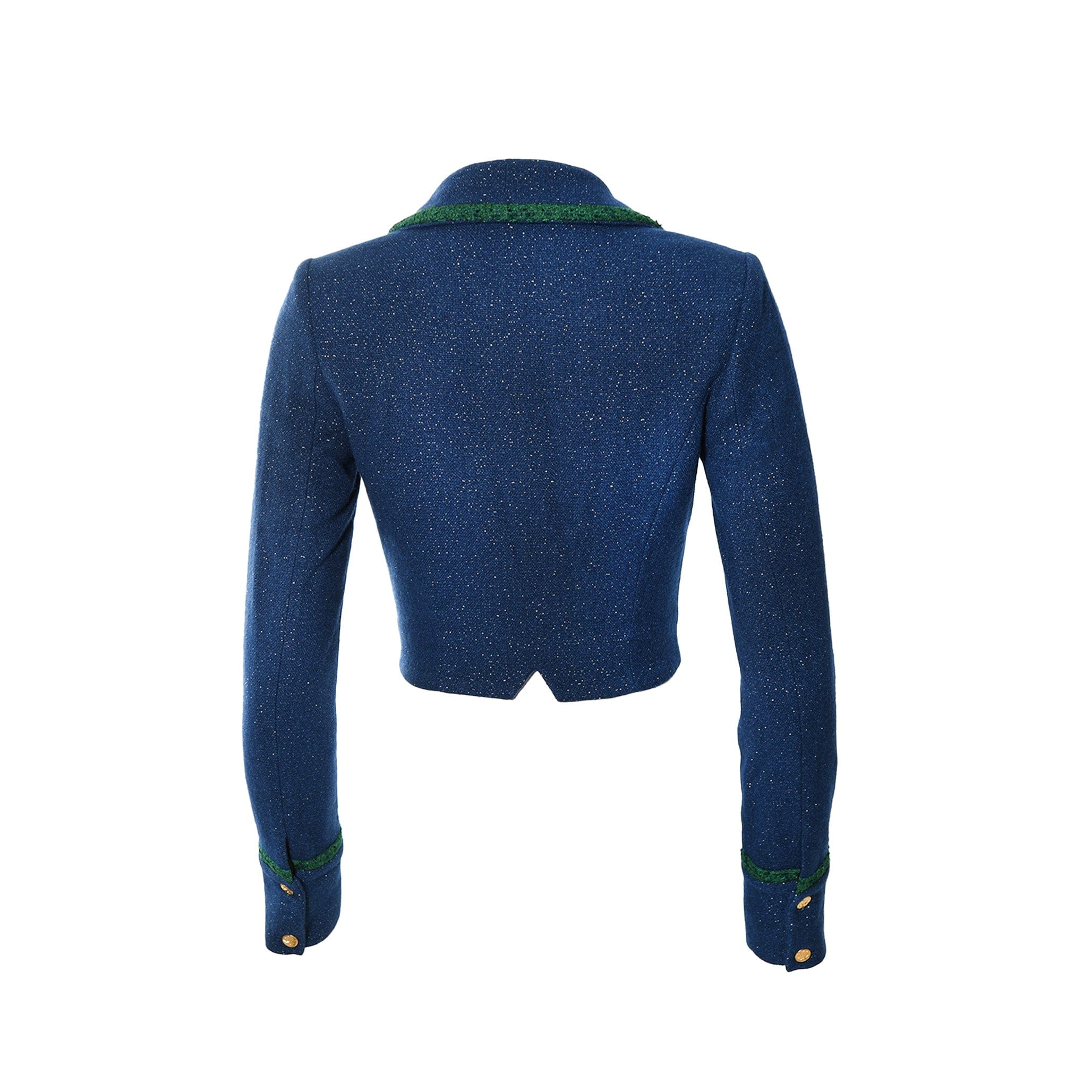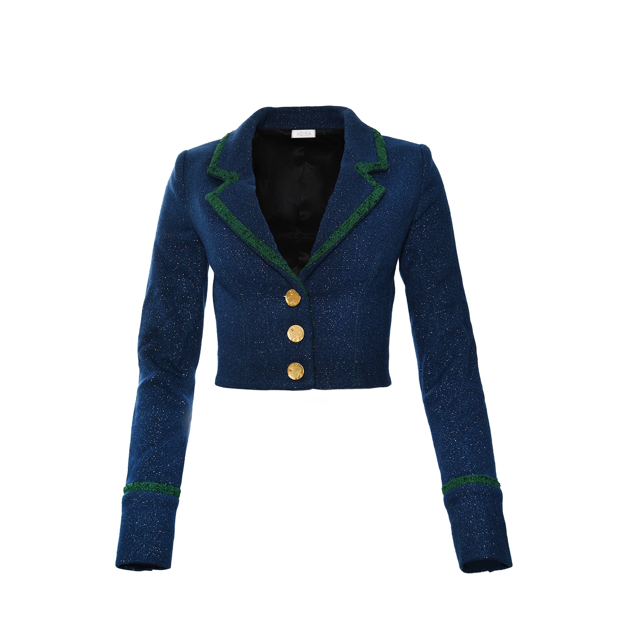 This Galaxy Tweed Cropped Top is crafted with a fitted, cropped style, long sleeves, and an exceptional navy blue fabric inspired by the stars in the night sky. Finishing this look with a set of beautiful gold plated moon and stars buttons. Timeless and unique, this top is perfect for any occasion