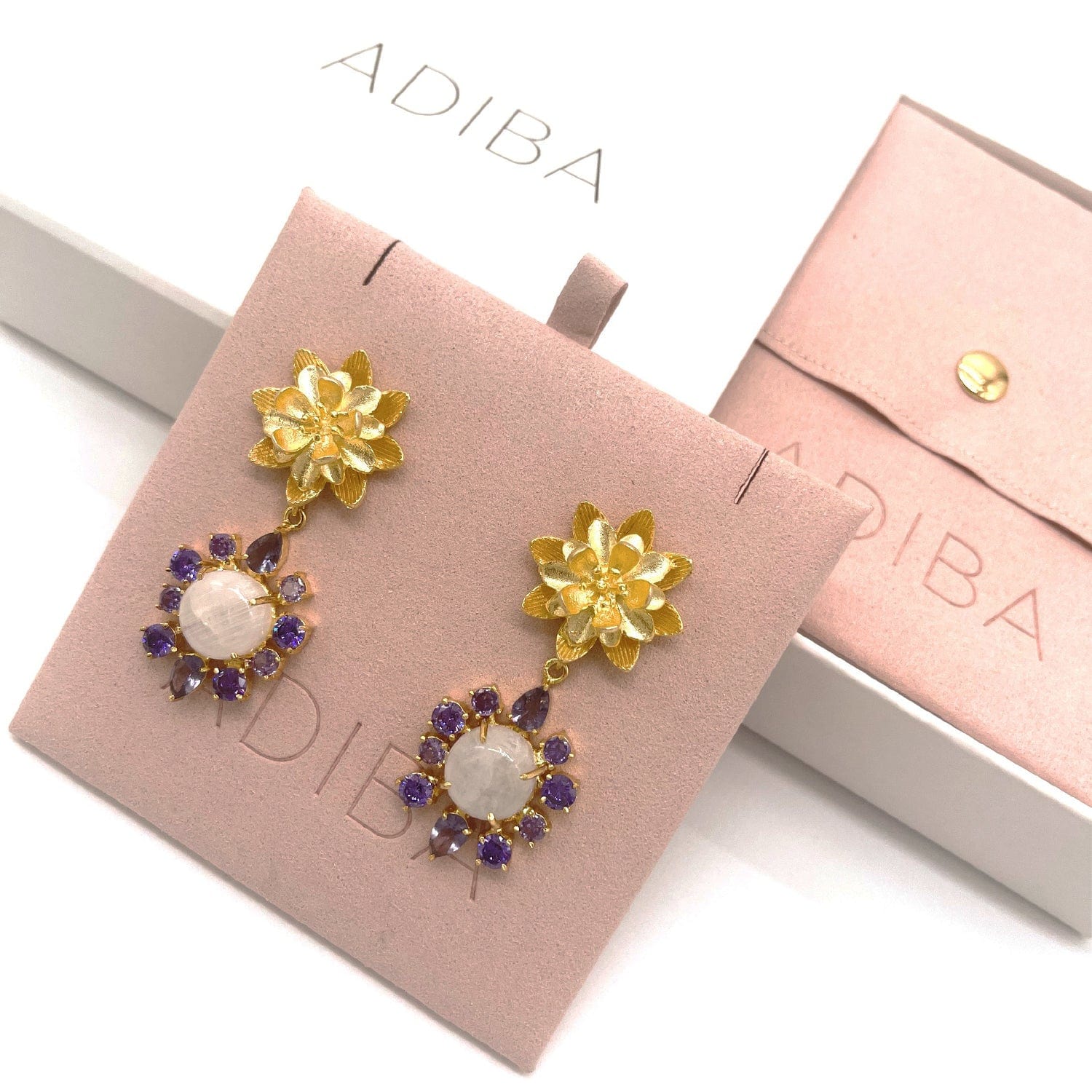 Looking for a Statement Piece? Take a look at this beautiful handmade moonstone Earring. The Moonstone earring is handmade of 24K Gold plated brass featuring precious moonstone and precious amethyst zircon stones.
