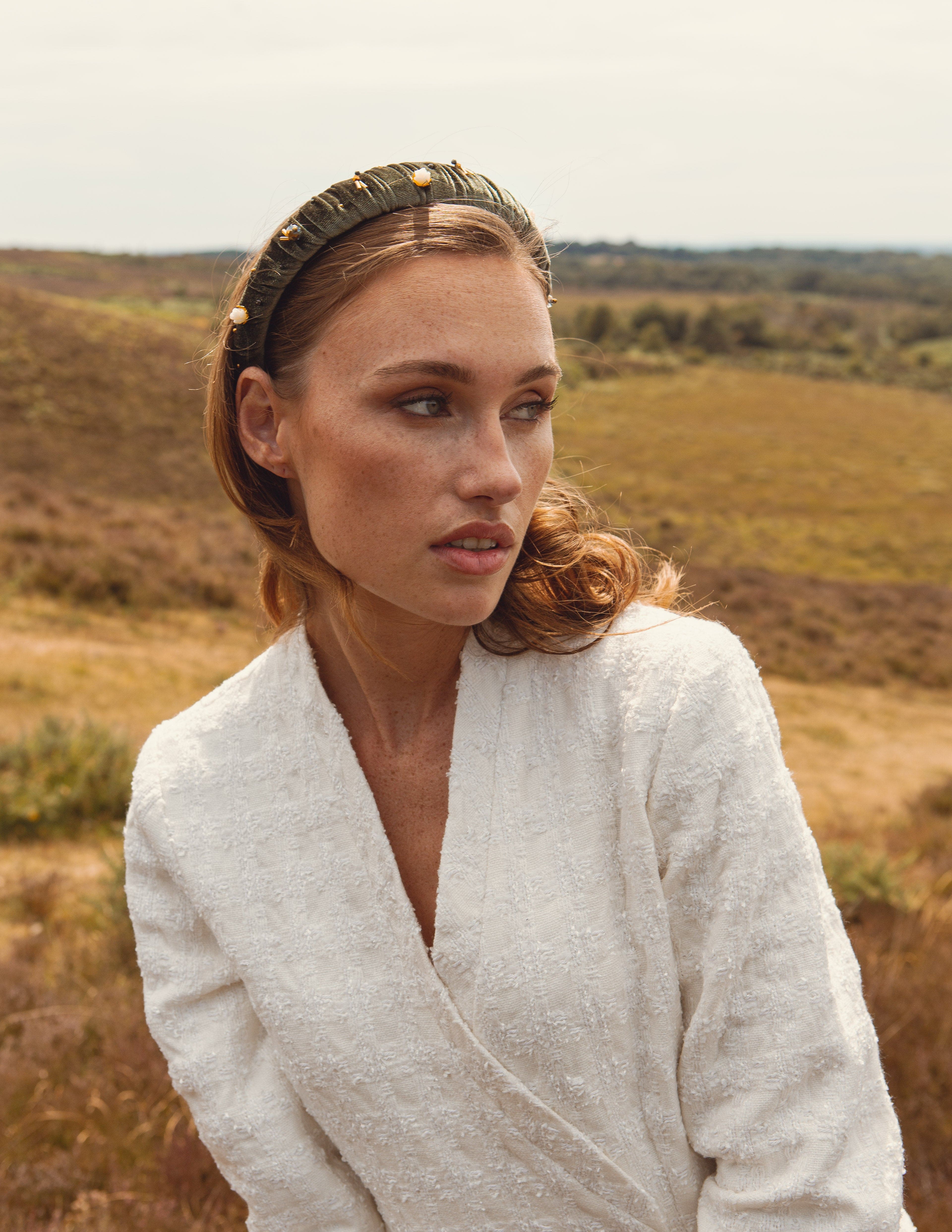Looking for Elegance this season? Adorn your head with this beautiful Myrtle Headband. Hand-Sewn with enamel flowers, Charcoal and gold crystals on a beautiful soft olive green velvet base. its stunning and light weight for comfort.