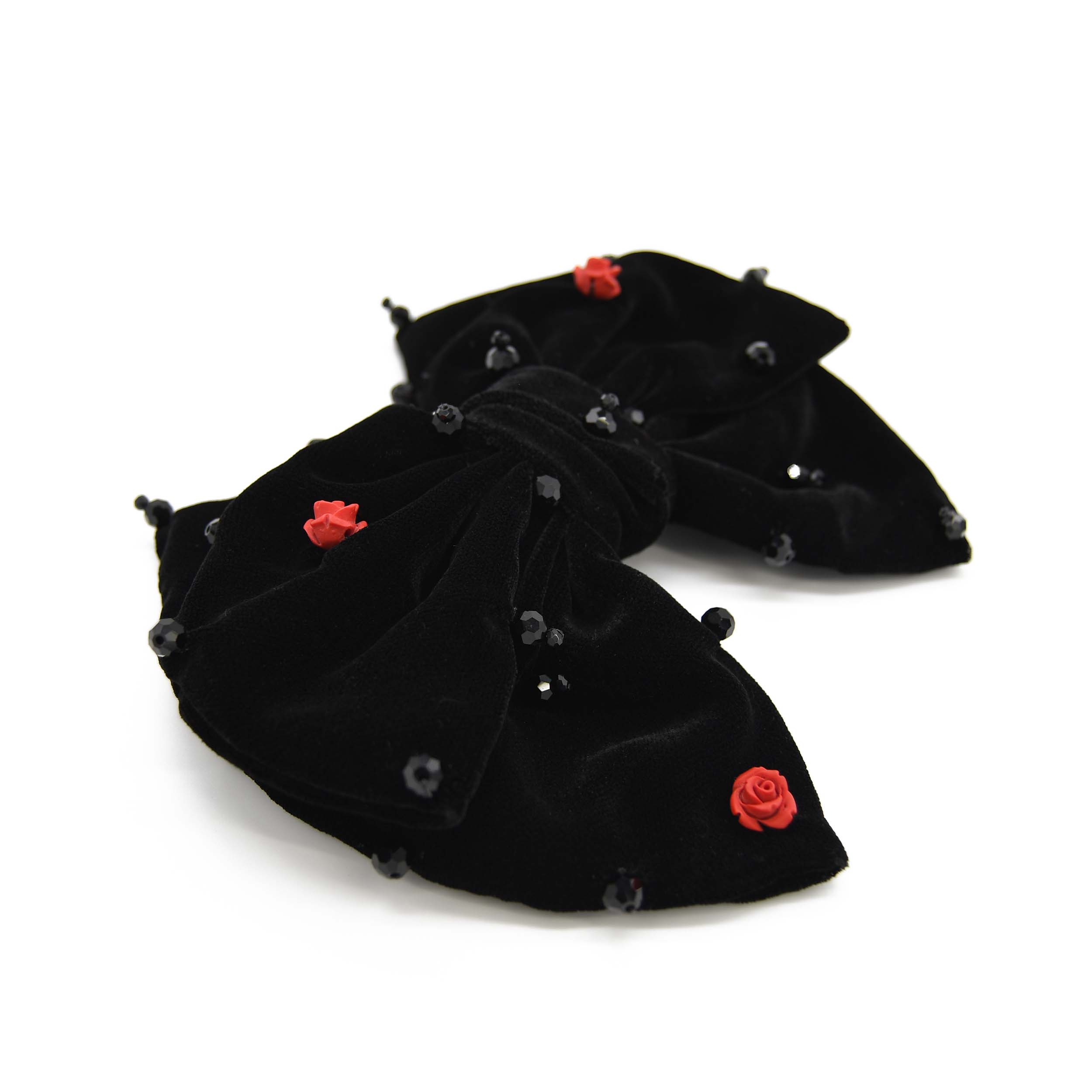 The glamorous barrette bow is hand-sewn with shiny beautiful black glass beads and stunning enamel rose flowers on a soft velvet base. It is very soft luxurious texture and light weight.